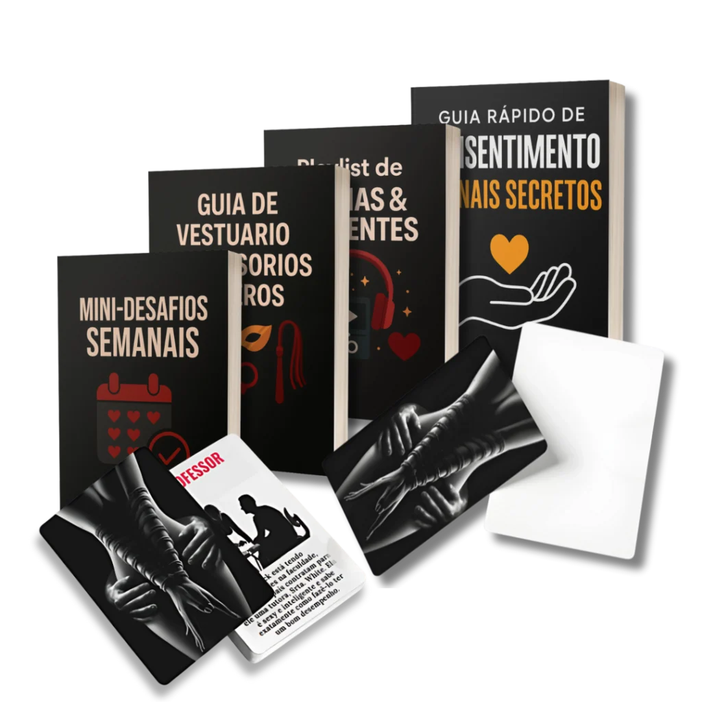 Você recebe um baralho com 50 cenas originais (PDF imprimível + versão mobile), um guia rápido com checklists de consentimento, palavra de segurança no modelo Semáforo e sugestões de pós-cena, além de modelos de cartas em branco para personalizar suas próprias fantasias.